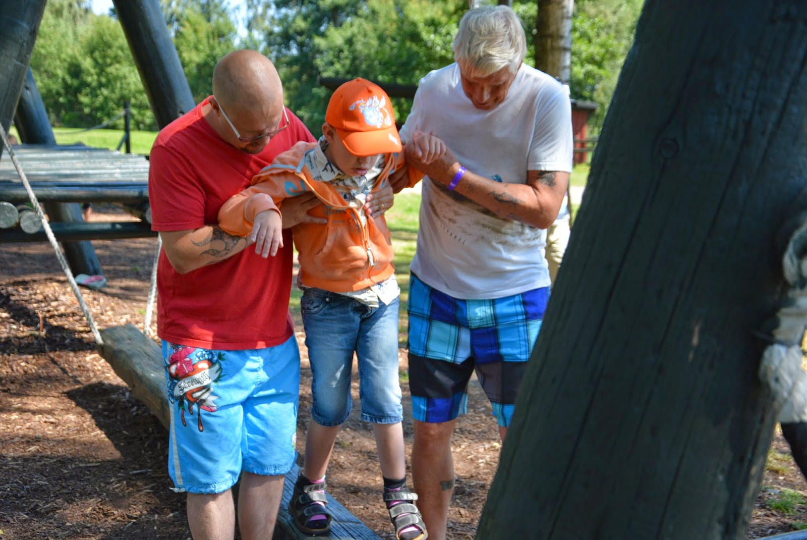 Vi startade i badlandet och Ludvig var lite tveksam från början till att byta om men väl nere i vattnet så såg vi hur han njöt. De har en vattenrutschkana där de åker i badringar, en ganska hög kana och med två personer i däcket medför ännu högre fart. Ludvig skrattade så han nästan kiknade förra året så det var självklart att han skulle få åka även i år. Backen upp är lång och brant så Kristian tog Ludvig i rullstolen upp och morfar tog badringen. De hjälptes åt att få ner Kristian och Ludvig i ringen och sen blev det till att åka :-). I vattnet när de kom ner stod Kristians kusinbarn och tog emot dem och stoppade upp farten så inte de åkte ner under vattnet medan morfar tog sig förbi hela kön för att komma ner med rullstolen.